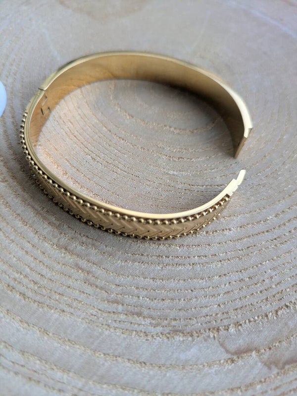 Slavenarmband bangle van stainless steel. De armband is perfect om te dragen tijdens een chique gelegenheid, maar kan ook speels gedragen worden door meerdere armbanden met elkaar te combineren. De armband is gemaakt van roestvrij staal met een v-relief en heeft een diameter van 6 cm.