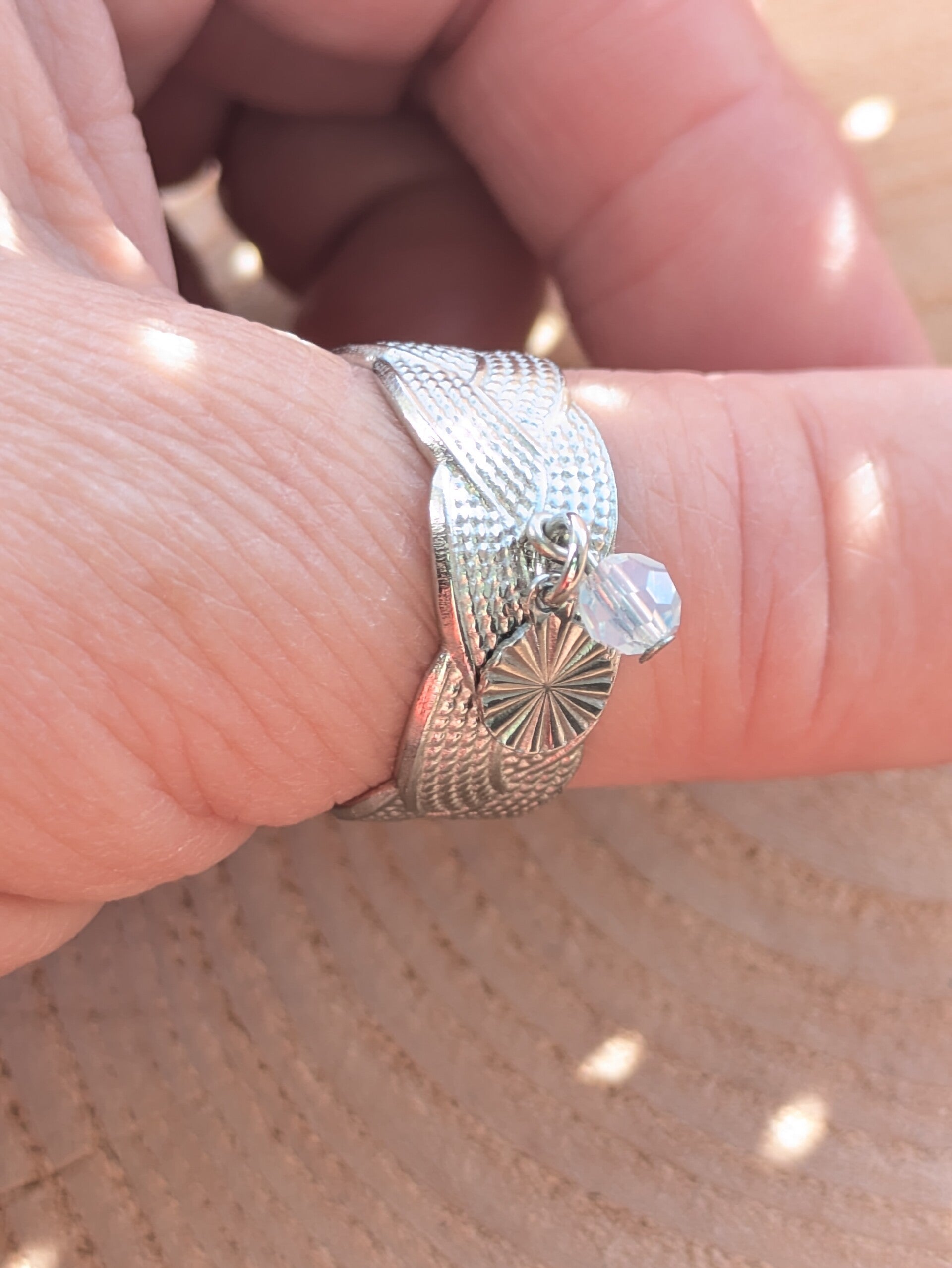 Mooie brede ring met bedels. Stainless steel en in maat aan te passen.