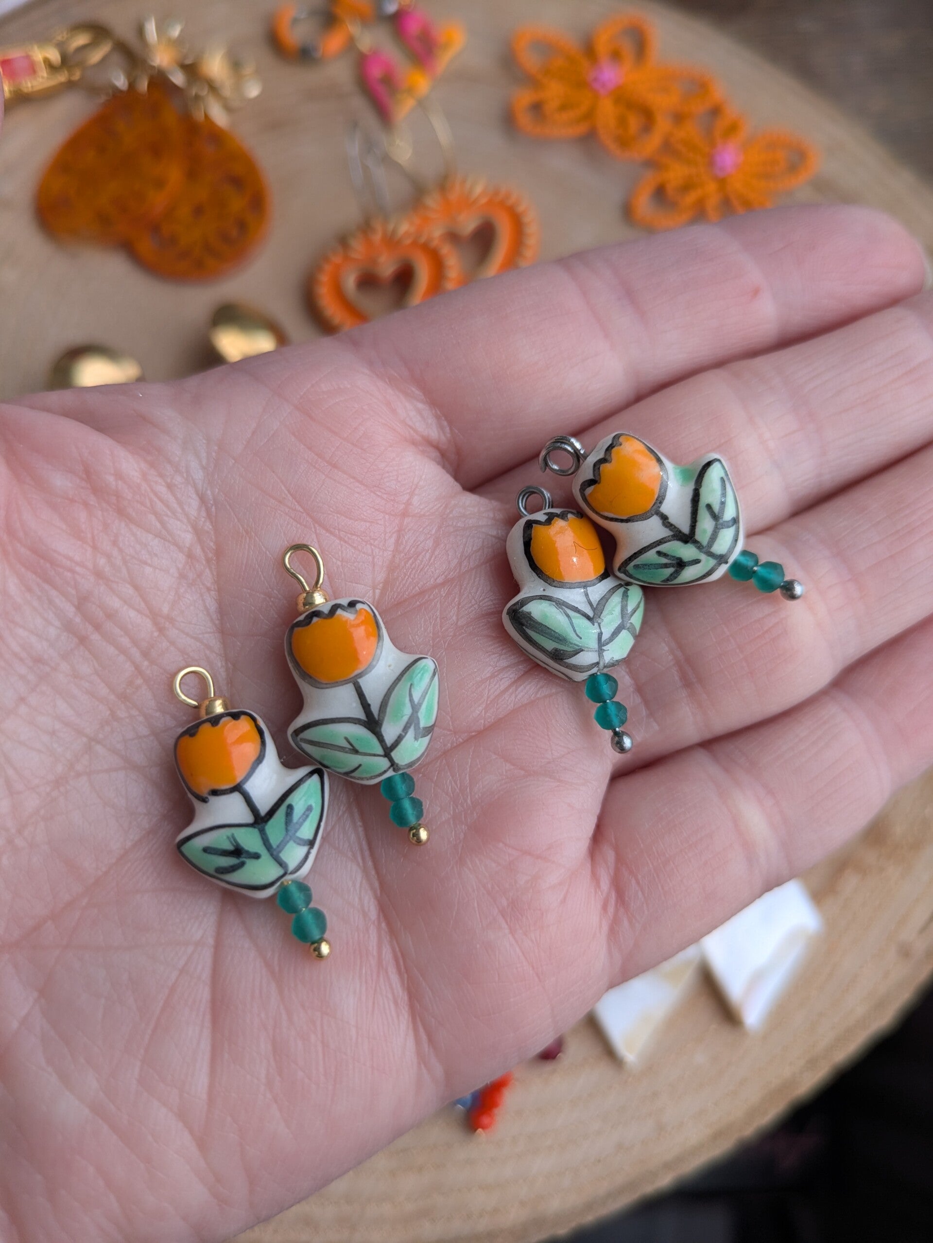 Deze keramieke tulpjes zijn aan beide kanten beschilderd. Je hangt ze gemakkelijk zelf ook je oorringen. Per stuk verkocht.